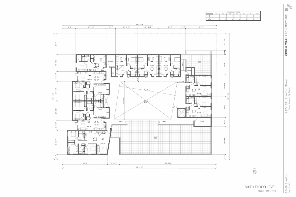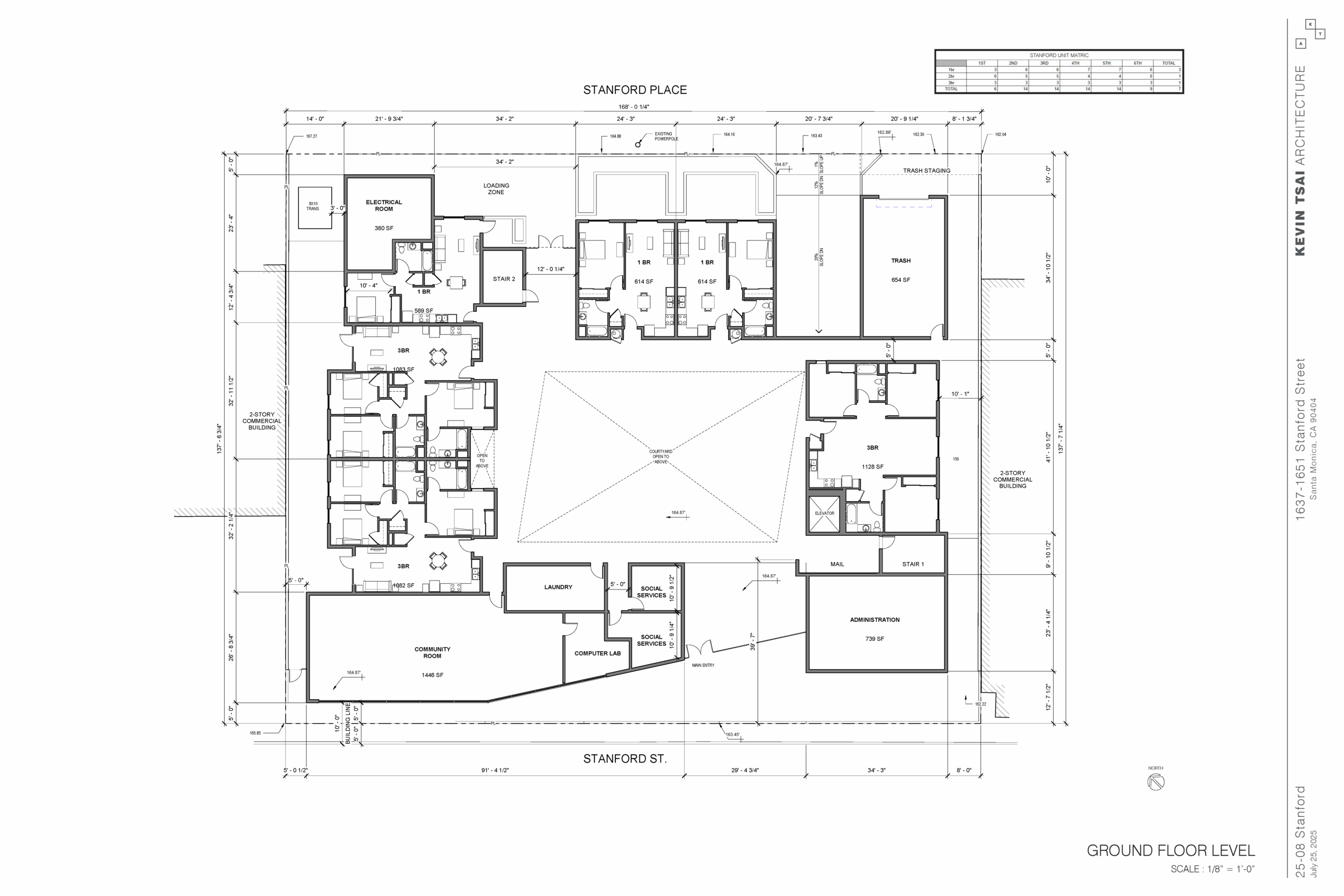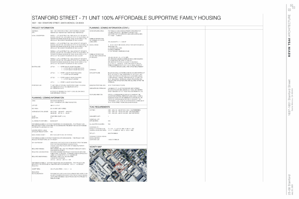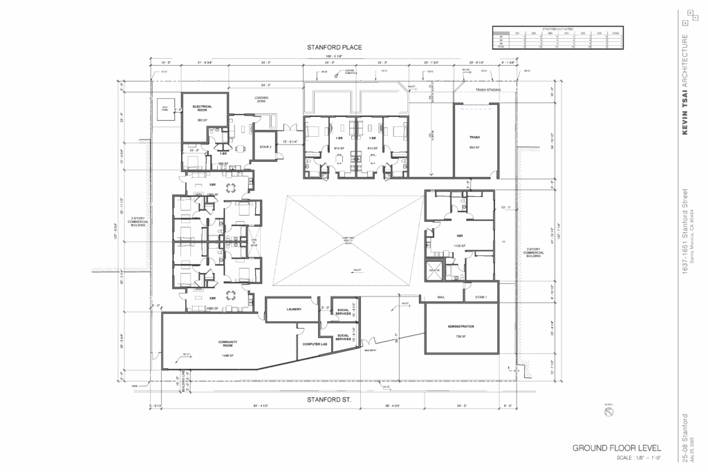 “Stanford,” the proposed project, represents a 71-unit 100% affordable multifamily community that will target large family households earning between 30%-80% AMI. There will be 35 one-bedrooms, 18 two-bedrooms (including 1 manager’s unit), and 18 three-bedrooms. The project spans approximately 66,900 sf of residential and amenity space, with a maximum height of six stories. Stanford will include a courtyard, community room, tot-lot, laundry room, bike storage room, 54 parking spaces, edible garden, roof deck, and offices for property management and residential services.